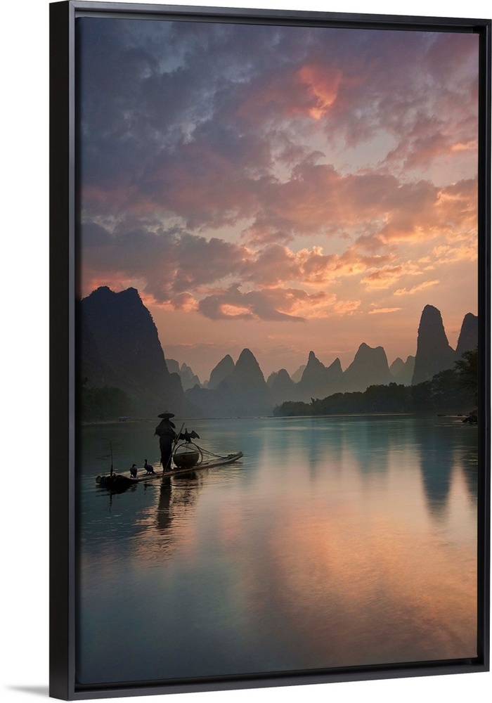 <p>A fisherman on a boat in the Li River, with beautifully colored clouds at sunrise, China.</p>