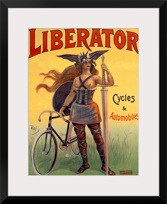 <p>Liberator Bicycles & Automobiles Poster. Faced with the concept of "liberator," other designers might have thought of a male figure (as, in fact, can be seen on the firm's logo), but Pal finds a way to inveigle one of his curvaceous beauties into the scene. A most definitive sign of the popularity of this design is the fact that abundant reprintings were executed by several different printing firms utilizing the talents of various other posterists to do nothing but redraw Pal's original artwork, such as this Charles Tichon variant or another by Emile Clouet. What remains identical in every version is the resolute "Don't mess with me, Mister" look of the sturdy "Soldat Gaulois," standing guard with her awesome armory of sword, shield and helmut, and of course, Liberator bicycle. Rarely has the saying "If it ain't broke, don't fix it" been applied with such resolute beauty.</p>