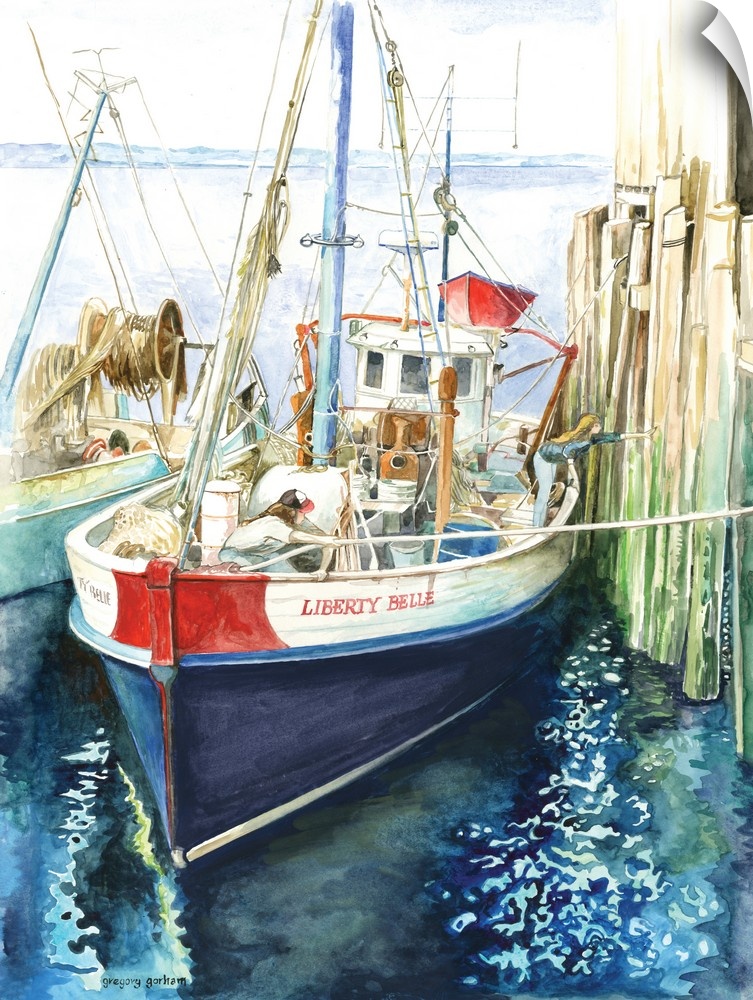 <p>Contemporary watercolor painting of a fishing boat named the "Liberty Bell" tying up to the dock.</p>