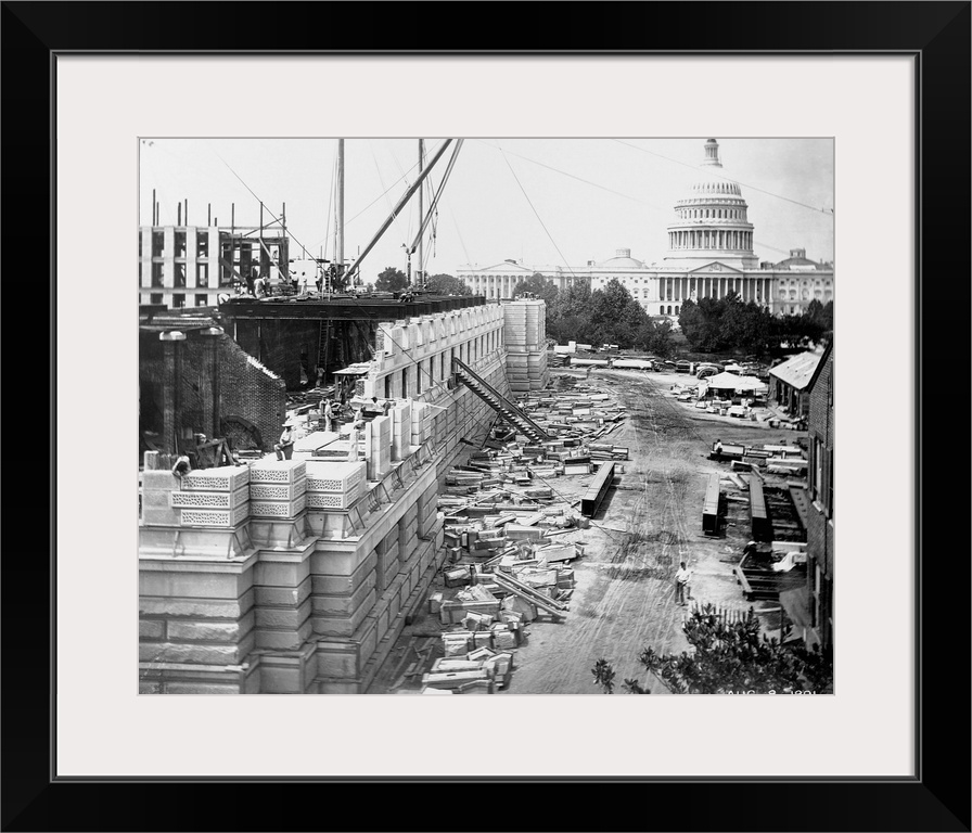 <p>The basement and first floor of the Library of Congress are under construction. The U. S. Capitol can be seen in the background. Washington D. C., August 8, 1891.</p>