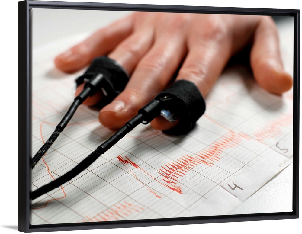 <p>MODEL RELEASED. Lie detector test. Pulse meters on a man's fingers used for a lie detector, or polygraph, test. Under the subject's hands are the traces produced by the polygraph. A polygraph records changes in a number of physiological processes, as a series of questions are asked by an examiner. As well as measuring heart rate with these pulse meters, blood pressure and respiration rate are also measured. The examiner interprets the results to determine if the subject demonstrated deceptive behaviour. The reliability of polygraphs is controversial and their evidence is not admissible in court.</p>