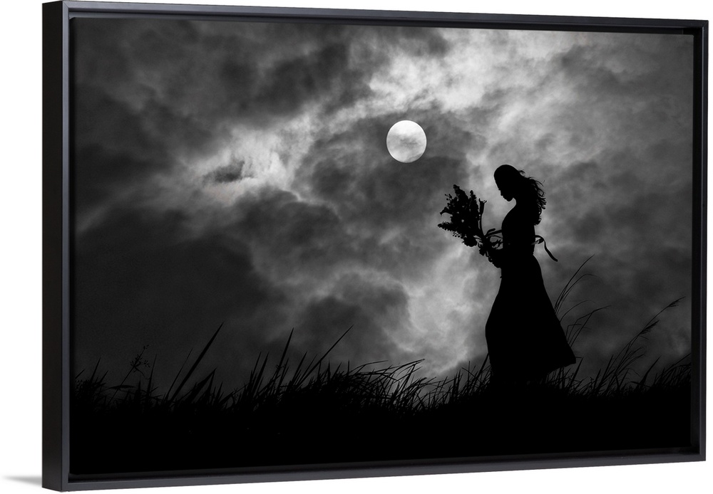 <p>Silhouette of a woman holding a bouquet of flowers in a field, in the moonlight.</p>