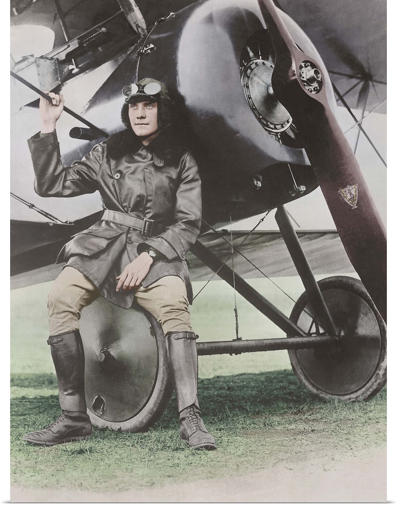 <p>Lieutenant Earl Carroll, prominent composer, seated on the wheel of his fast scout airplane while serving as an aviator in the U.S. Service during World War I, 1918. This photo has been digitally restored and colorized.</p>