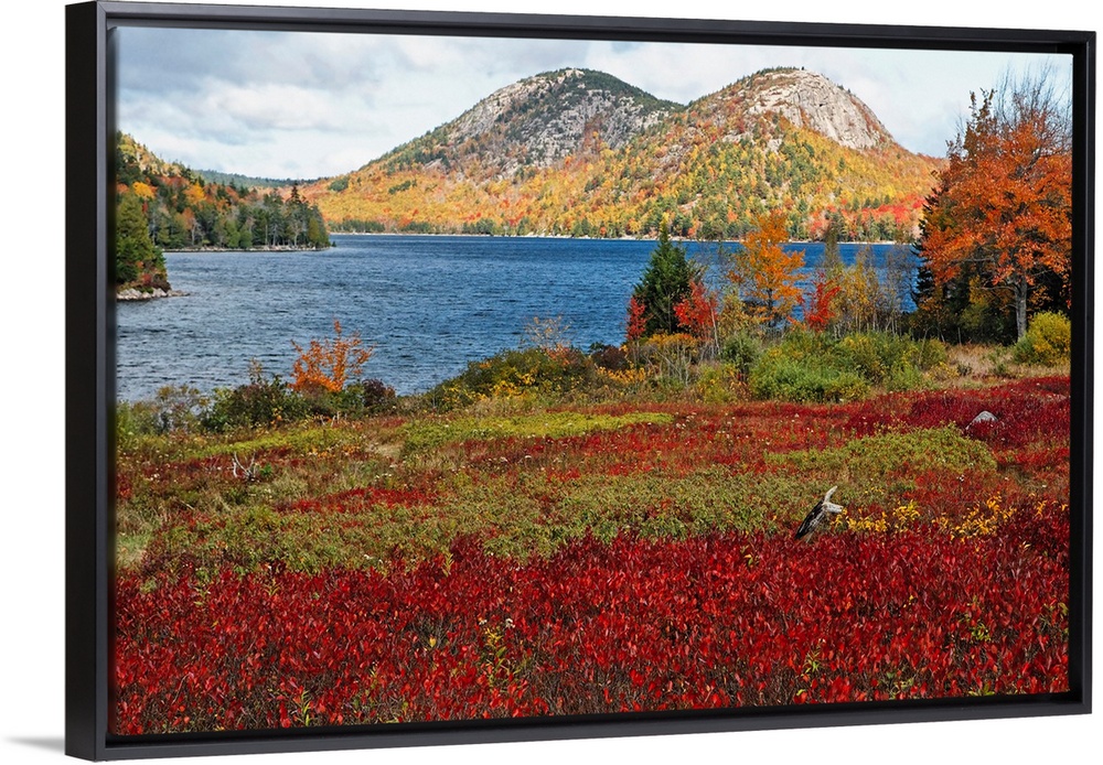 <p>Large, landscape photograph of Jordan Pond and the Bubble Mountains, surrounded by autumn color, in Acadia National Park, Maine.</p>