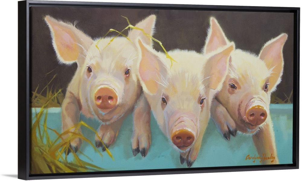 <p>Contemporary artwork of endearing piglets in a teal container filled with hay.</p>
