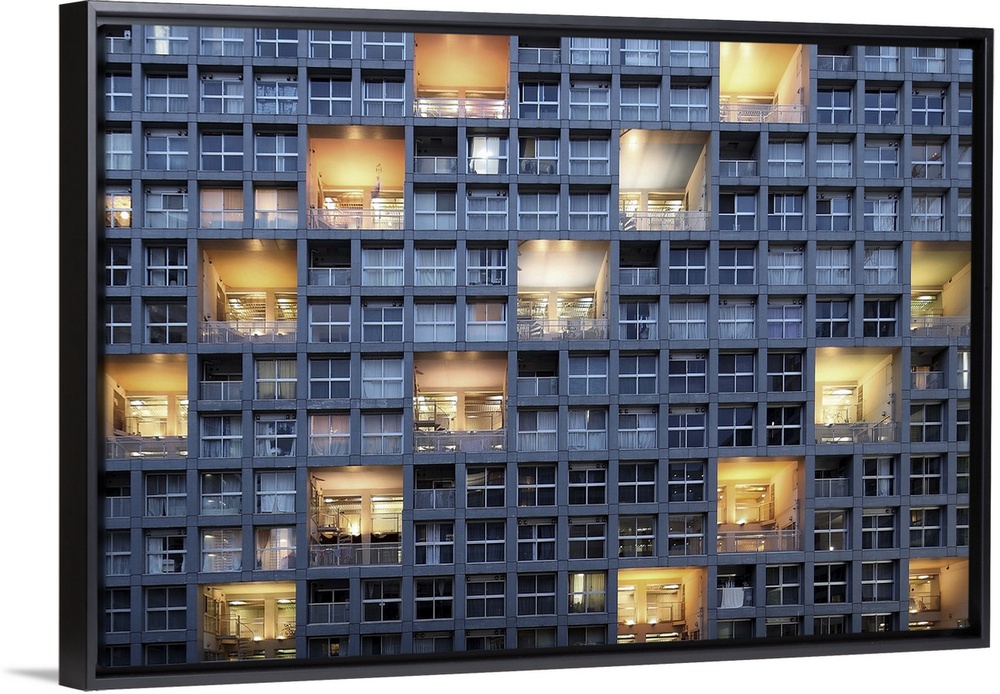 <p>The side of a building filled with windows, and a repeating pattern of lit balconies.</p>