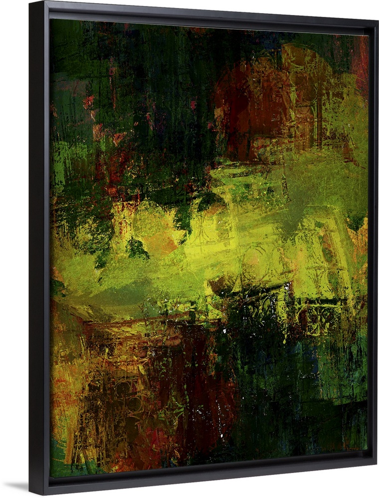 <p>An abstract expressionist image of shimmering textures in golds, russets and greens.</p>