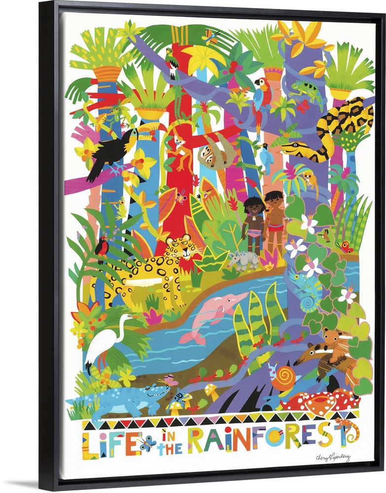 <p>Colorful children's art of the variety of plants and animals in the rainforest.</p>
