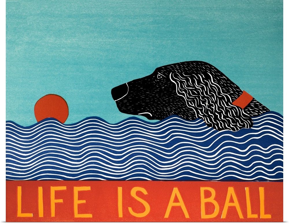 <p>Illustration of a black dog swimming to fetch a red ball in the water with the phrase "Life is a Ball" written on the bottom.</p>