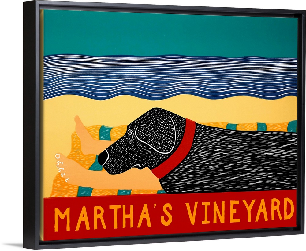 <p>Illustration of a black lab laying next to its owner on the beach at Martha's Vineyard.</p>
