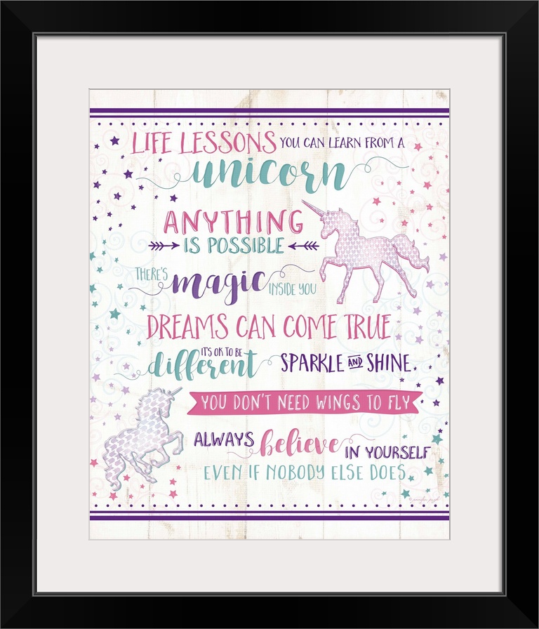 <p>"Life Lessons you can learn from a unicorn. Anything is possible, There's magic inside you, dreams can come true, it's ok to be different, sparkle and shine, you don't need wings to fly, always believe in yourself even if nobody else does"</p>