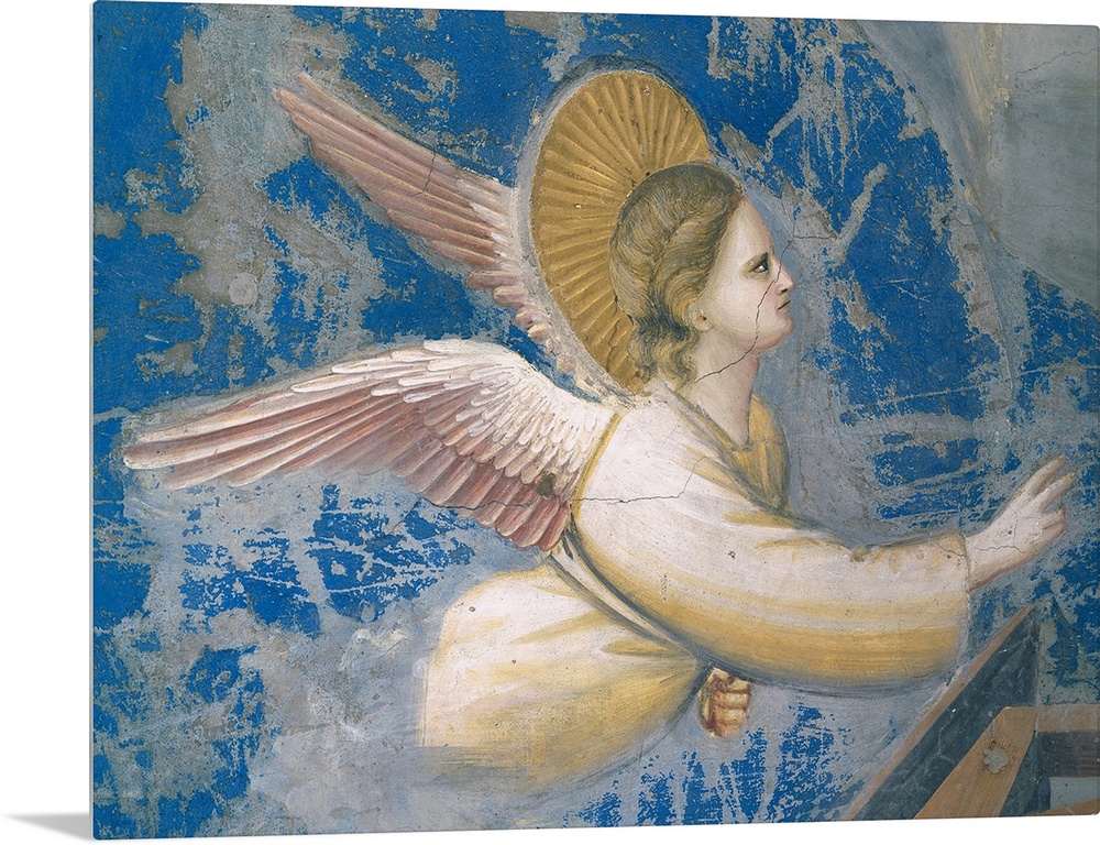 <p>Scenes from the Life of Christ Nativity Birth of Jesus, by Giotto, 1304 - 1306 about, 14th Century, fresco, cm 200 x 185 - Italy, Veneto, Padua, Scrovegni Chapel. Detail. Angel above right pink wings aureole halo. (521720) Everett Collection\Mondadori Por</p>