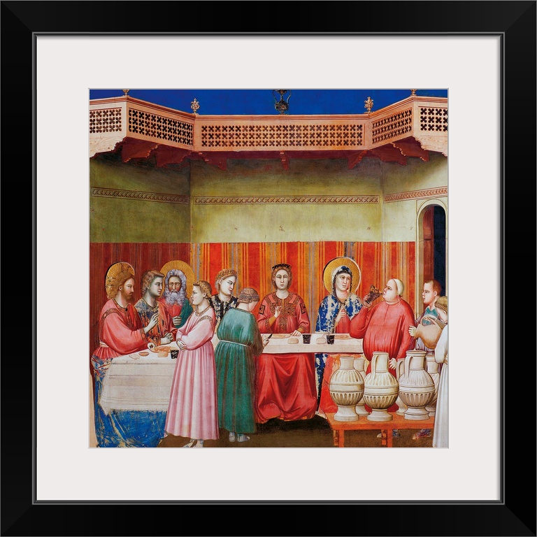 <p>Stories of Christ The Wedding at Cana or The Marriage Feast at Cana, by Giotto, 1304 - 1305 about, 14th Century, fresco, cm 200 x 185 - Italy, Veneto, Padua, Scrovegni Chapel. All. Banquet wedding marriage Jesus Christ Mary guests servants amphorae wine w</p>