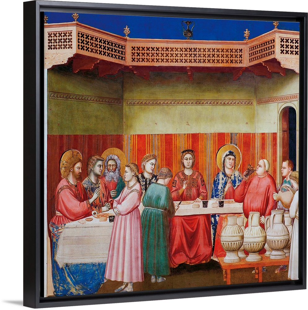<p>Stories of Christ The Wedding at Cana or The Marriage Feast at Cana, by Giotto, 1304 - 1305 about, 14th Century, fresco, cm 200 x 185 - Italy, Veneto, Padua, Scrovegni Chapel. All. Banquet wedding marriage Jesus Christ Mary guests servants amphorae wine w</p>