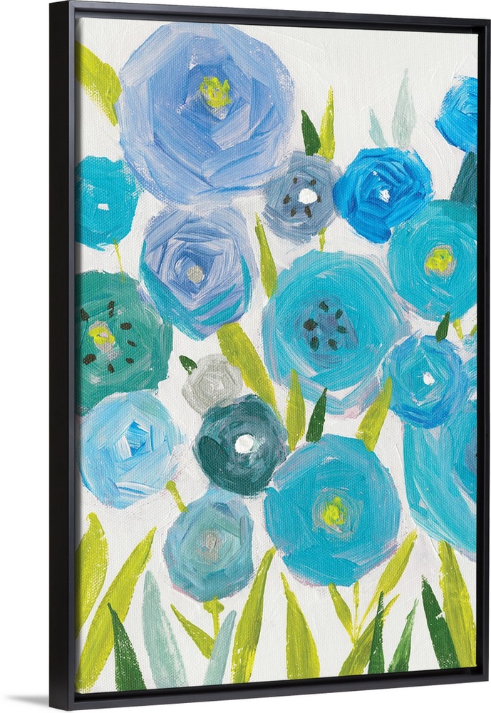 <p>A vertical painting of different shades of blue poppies against a neutral backdrop.</p>