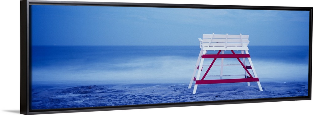 <p>Panoramic photograph on a big canvas of the back of an empty, wooden lifeguard chair sitting on the beach in front of blue waters in Cape May, New Jersey.</p>