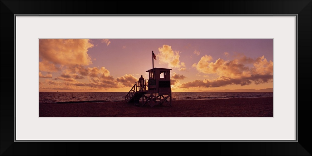 <p>Landscape photograph on a big canvas of the 22nd Street lifeguard station on Redondo Beach, silhouetted by the setting sun as one person stands on the hut, looking toward the water, in Los Angeles, California.</p>