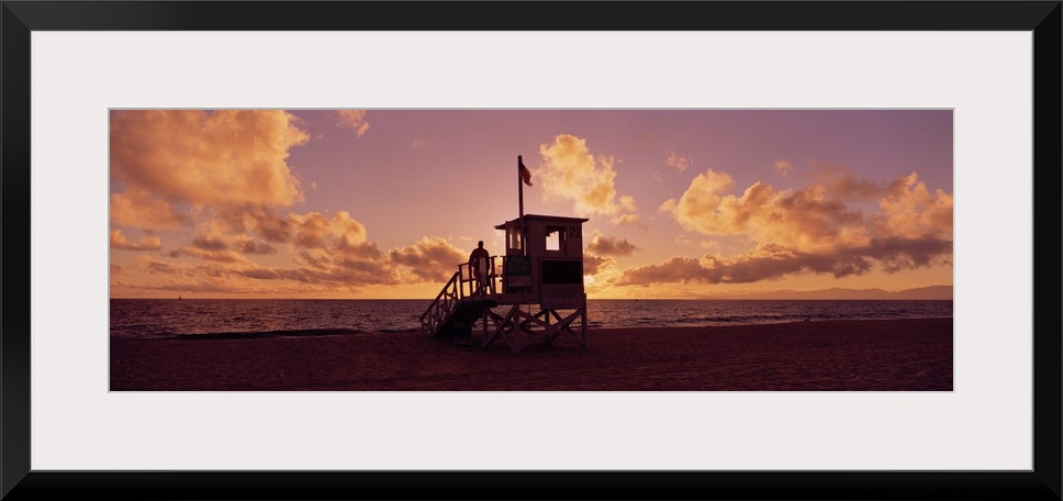 <p>Landscape photograph on a big canvas of the 22nd Street lifeguard station on Redondo Beach, silhouetted by the setting sun as one person stands on the hut, looking toward the water, in Los Angeles, California.</p>