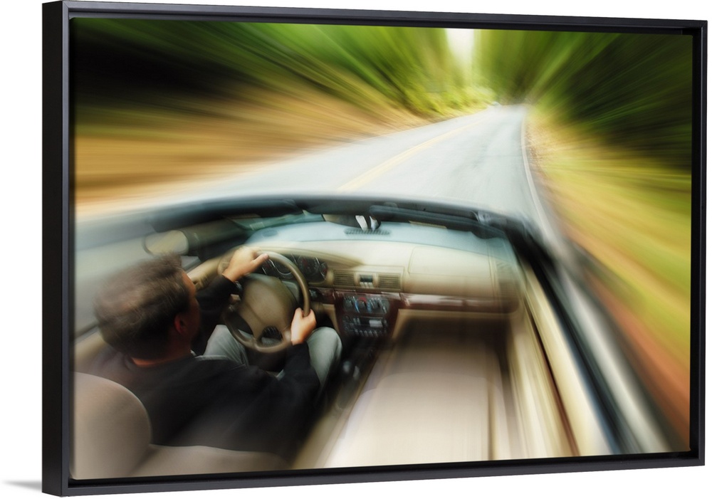 <p>lifestyle photograph of a caucasian man driving fast down a road in a convertible</p>