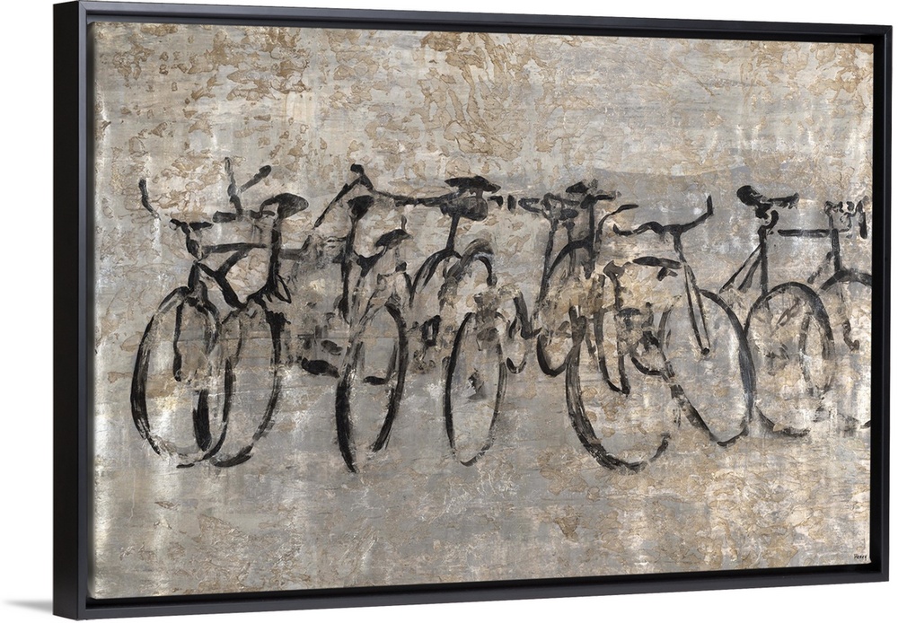 <p>Contemporary painting of a row of bicycles on a textured grey background.</p>