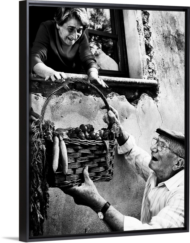 <p>A man handing a basket of fresh vegetables to a woman in a window.</p>