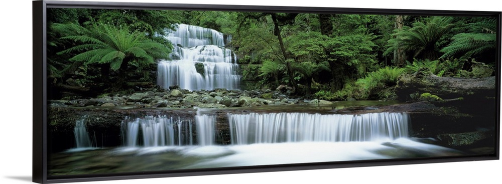 <p>This is a panoramic landscape photograph of water cascading down a tiered waterfall in a tropical forest.</p>