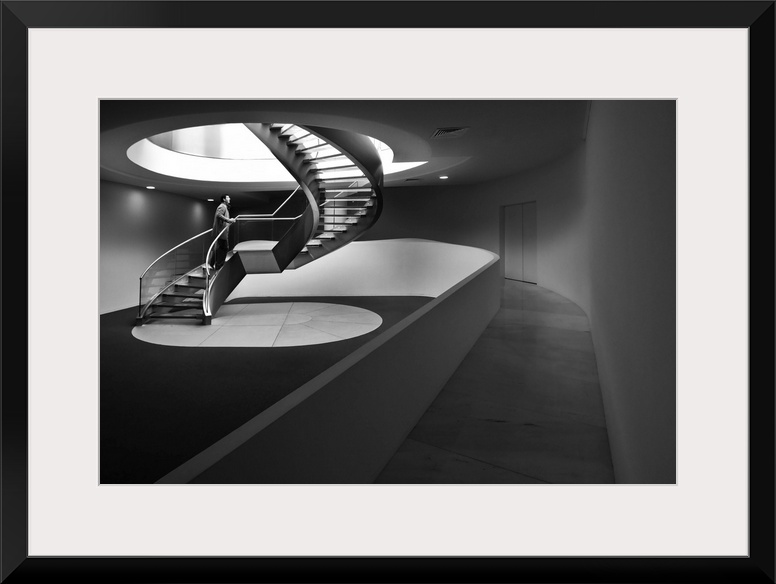<p>A man walking up a spiral staircase with light coming from the floor above, Porto, Portugal.</p>