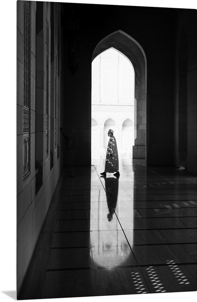 <p>A photograph of a man and architectural interior casting reflections on the floor.</p>