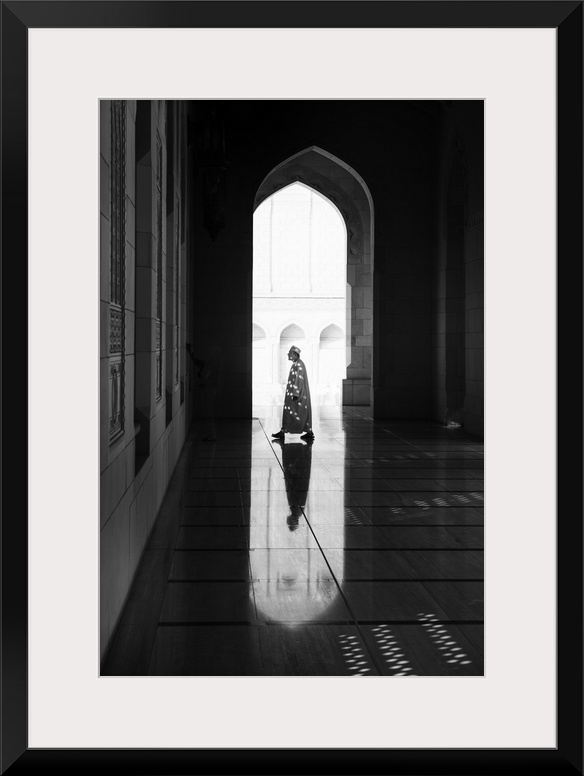 <p>A photograph of a man and architectural interior casting reflections on the floor.</p>