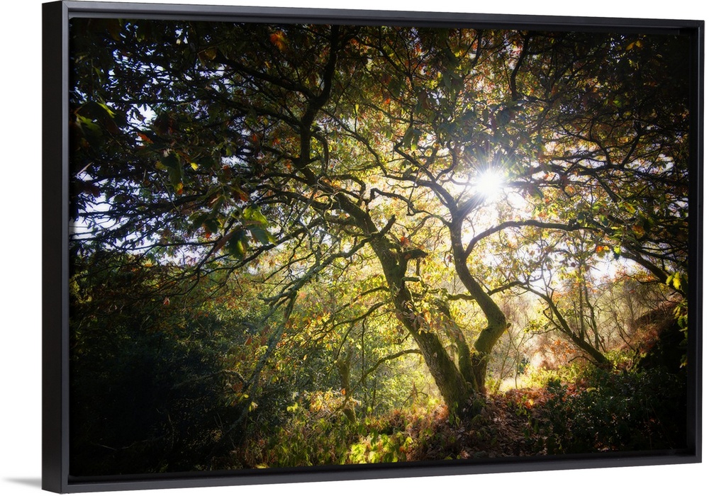 <p>Bright sunlight shining through the tops of the trees in a dense forest.</p>