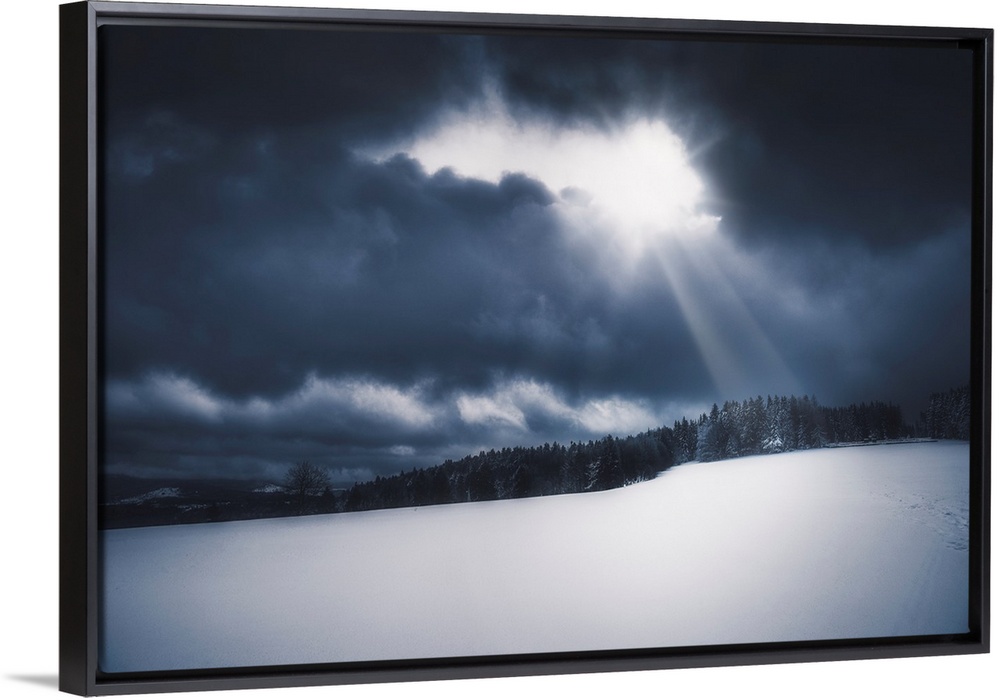 <p>Snowy landscape lit by the sun piercing a stormy sky</p>