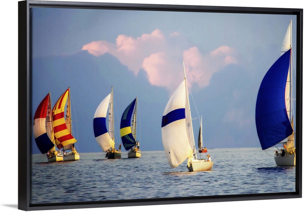 <p>A regatta of colorful sailboats with a cloudy sky.</p>