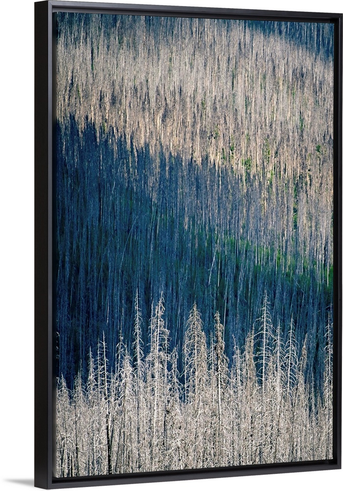 <p>Shadows falling on a forest of tall white trees in a hilly landscape.</p>