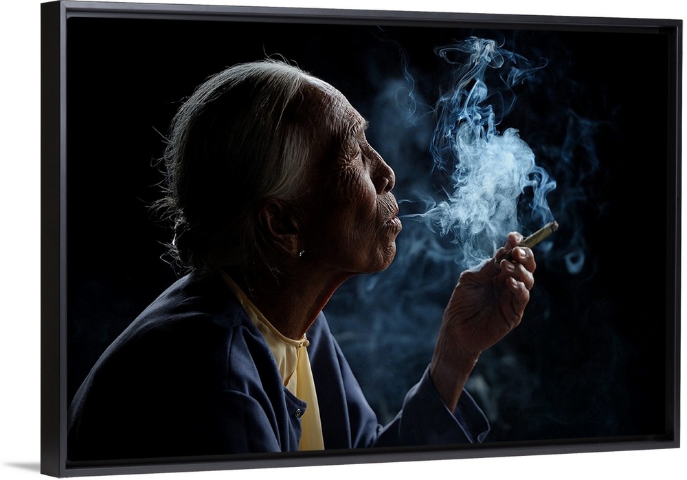 <p>A profile portrait of an old woman with smoke pouring from her mouth.</p>