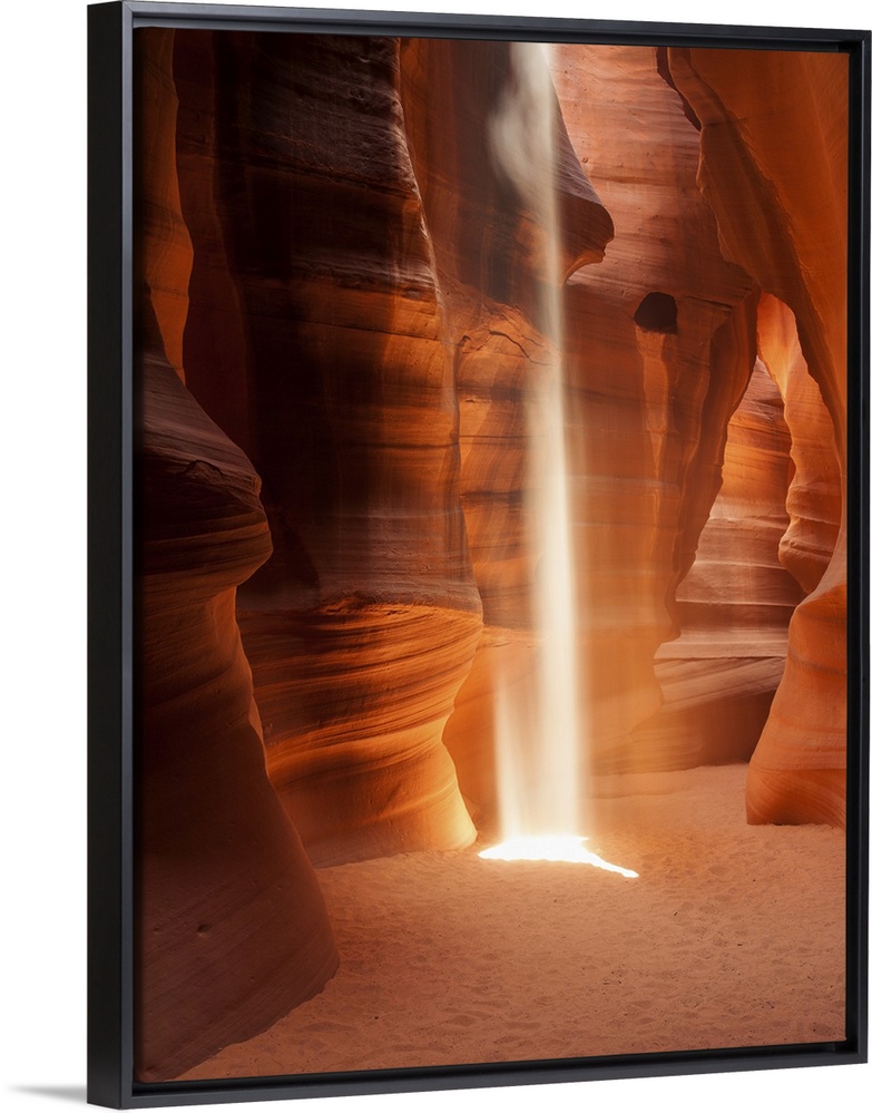 <p>An artistic photograph of a slot canyon with a shaft of sunlight piercing the crevasse above.</p>