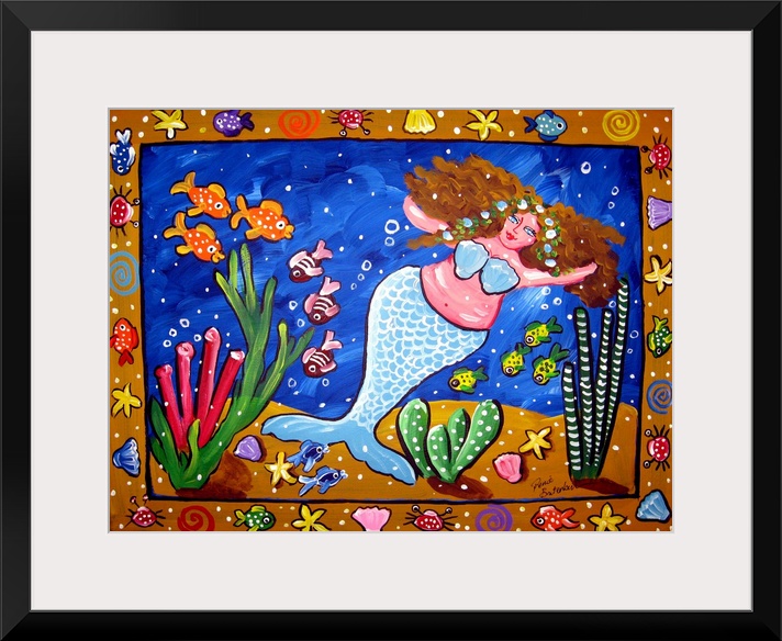 <p>Folk art border with fish, sea shells, star fish, surrounds the beautiful, chubby mermaid in light blue.</p>