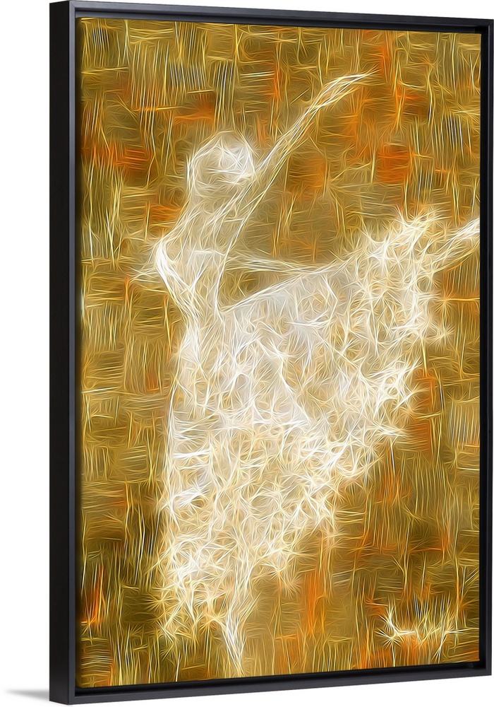 <p>Large digital illustration of a ballerina created with thin, woven lines on a gold and orange background.</p>