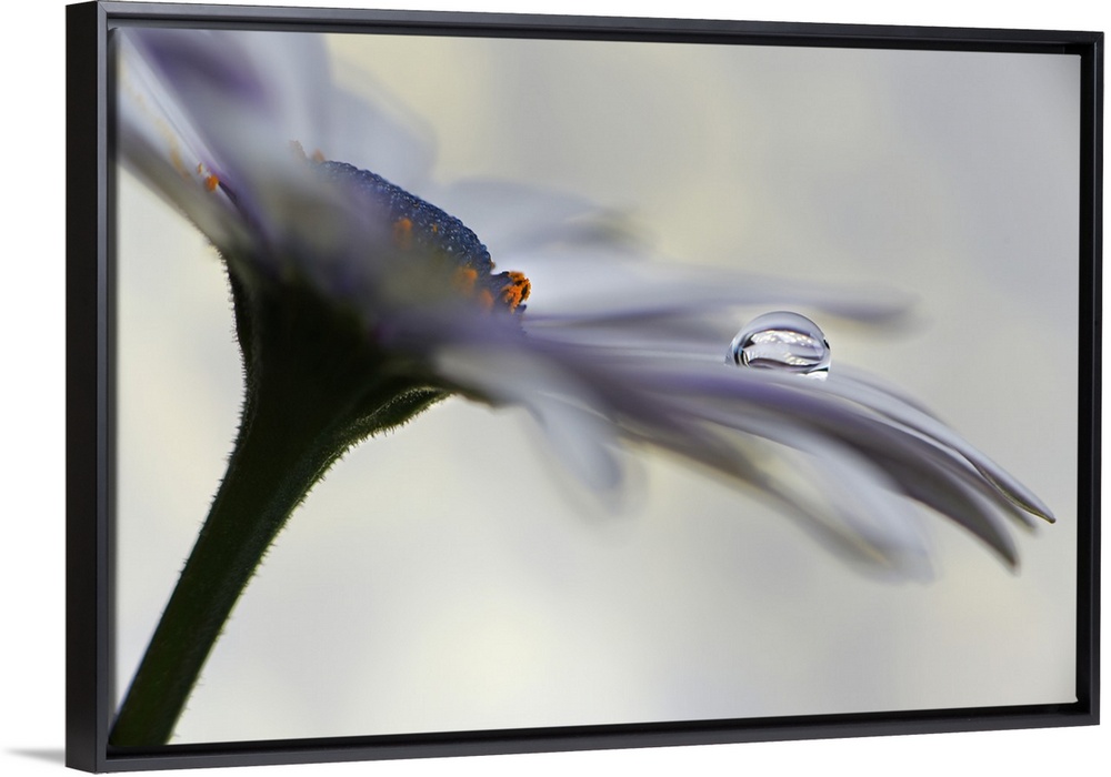 <p>Soft focus macro image of a dew drop on the petals on a daisy.</p>
