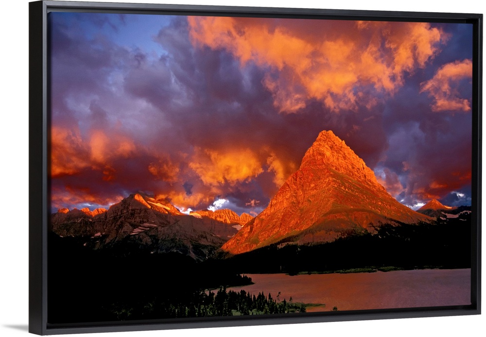<p>Wall docor of a rugged mountain range behind a lake lit up with intense warm light from a setting sun.</p>
