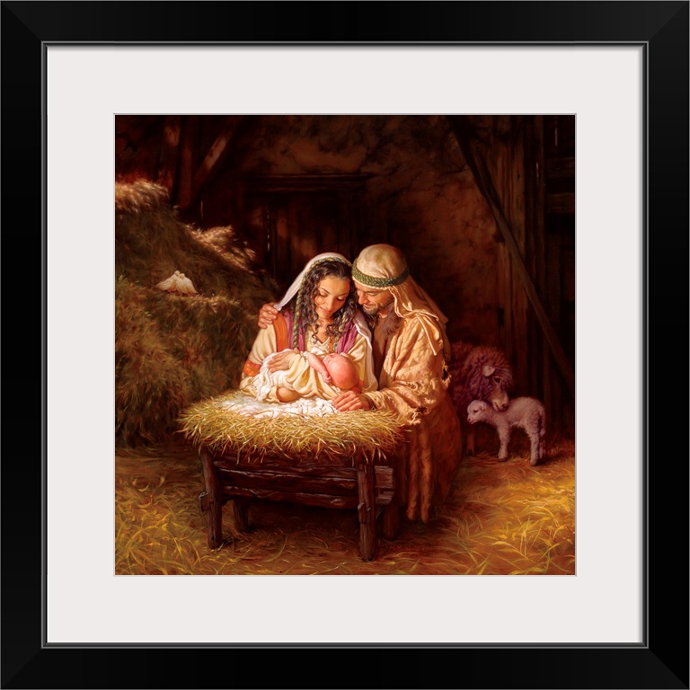 <p>Fine art painting of Mary and Joseph holding Jesus over a manger in a barn with animals and hay.</p>