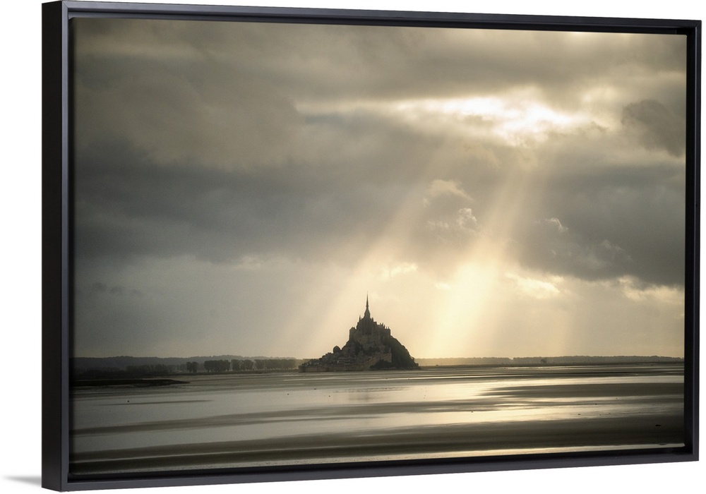 <p>Mont saint michel in normandy, France, before sunset! Sun rays passing throw the grey clouds giving a biblic style to the picture.</p>