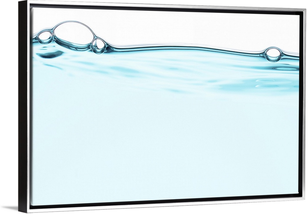 <p>Level Clean Clear light pale blue refreshing water drink with a couple of bubbles floating on the water surface tension on a white background in studio</p>