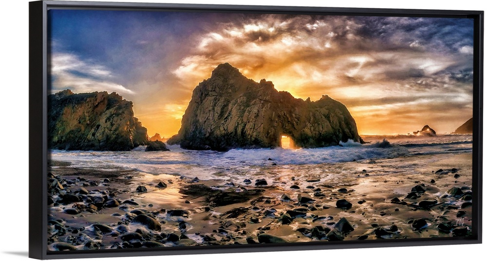 <p>Rays from the setting sun light up the sky and shine a spotlight through the famed "Keyhole" rock formation on Pfeiffer Beach in Big Sur. Some of the sand on this beach is purple in color, caused by the erosion of manganese garnet rocks in the cliffs above the beach.</p>