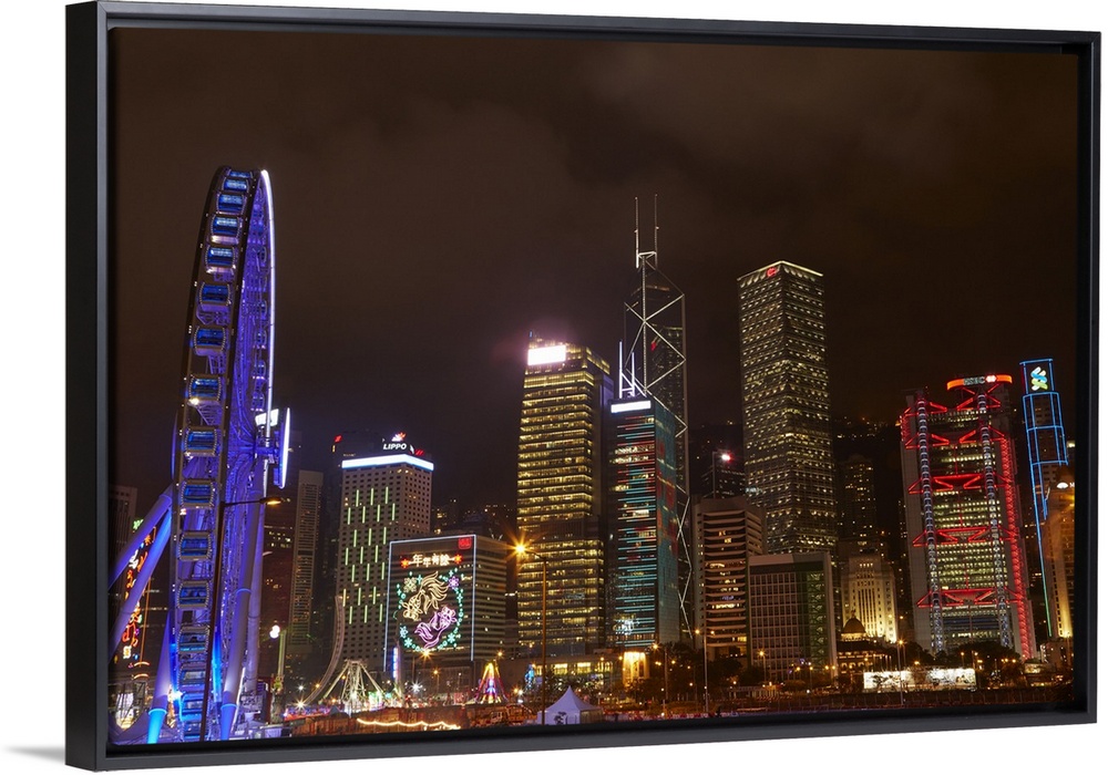 <p>Light show on skyscrapers, and Hong Kong Observation Wheel, Central, Hong Kong Island, Hong Kong, China</p>
