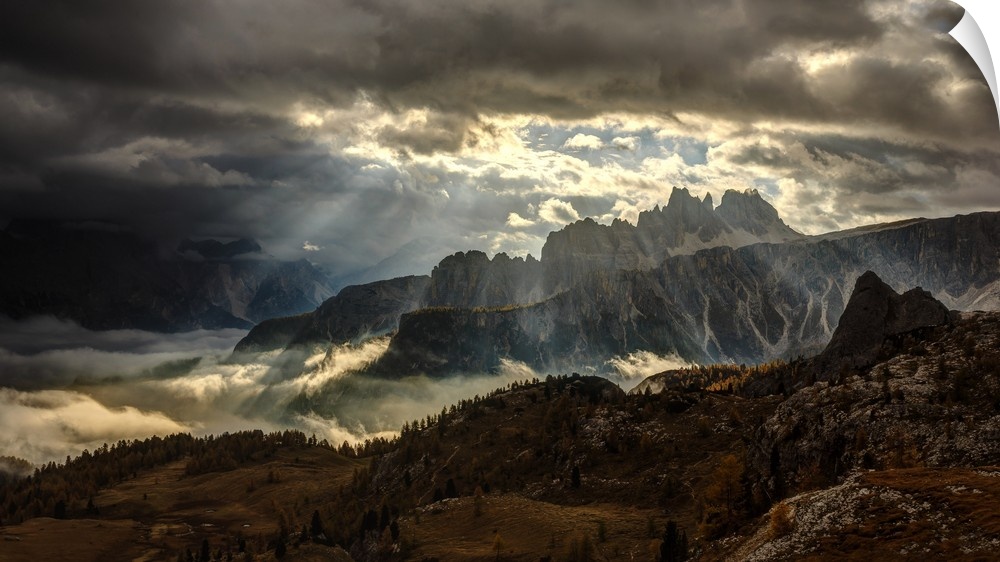 <p>Ray of sunlight shining through the clouds onto the peaks of the Dolomites.</p>