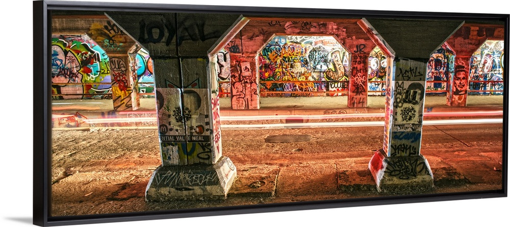 <p>Light trails from passing cars create a red glow, lighting up the graffiti on the walls and columsn in the Krog Street Tunnel, which connects Inman Park and Cabbagetown, downtown Atlanta, Georgia.</p>