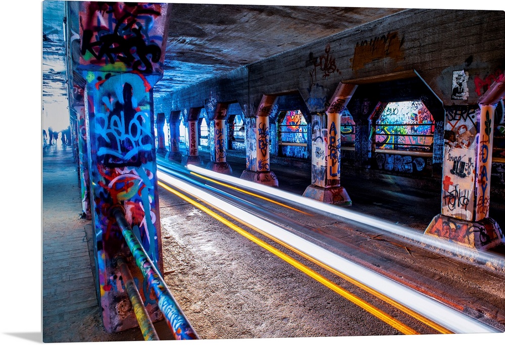 <p>Light trails from passing cars create a bright glow, lighting up the graffiti on the walls and columsn in the Krog Street Tunnel, which connects Inman Park and Cabbagetown, downtown Atlanta, Georgia.</p>