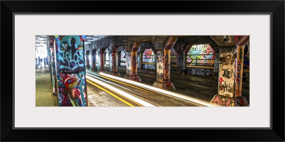 <p>Light trails from passing cars create a bright glow, lighting up the graffiti on the walls and columsn in the Krog Street Tunnel, which connects Inman Park and Cabbagetown, downtown Atlanta, Georgia.</p>