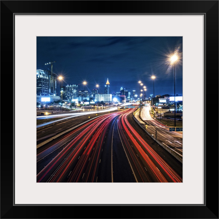 <p>Light trails from passing cars on the road headed towards the Atlanta, Georgia skyline at night.</p>