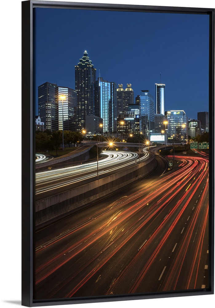 <p>Light trails from passing cars on the road headed towards the Atlanta, Georgia skyline at night.</p>